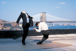 Robert Longo realisierte seine Fotosequenz „Men in the Cities“ Ende der 1970er-Jahre auf dem Dach seines Lofts an der Manhattan Bridge in New York. Wir sehen Menschen in unnatürlichen Posen, deren Bewegungen fotografisch eingefroren sind; es könnten wilde Tänze sein oder Zitate aus amerikanischen Western, aus Kriegs- oder Gangsterfilmen, etwa wenn einer der Protagonisten im Kugelhagel stirbt.